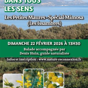 Avec Denis Huin, guide naturaliste Balades naturalistes pour découvrir les Maures, dans ses différentes facettes, en adret, en ubac, en fond de vallon, en crête. Et tous vos sens seront sollicités. Les Petites Maures, spécial mimosa (2h30 à 3h) Voir le mimosa dans tous ses états, voir la brillance et le feuilletage fin du mica, … ...