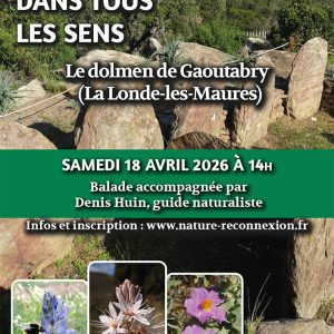 Avec Denis Huin, guide naturaliste Balades naturalistes pour découvrir les Maures, dans ses différentes facettes, en adret, en ubac, en fond de vallon, en crête. Et tous vos sens seront sollicités. Le dolmen de Gaoutabry (2h30 à 3h) Voir les minuscules feuilles de l’adénocarpe de Toulon, voir les butineurs de toutes sortes parmi les fleurs … ...